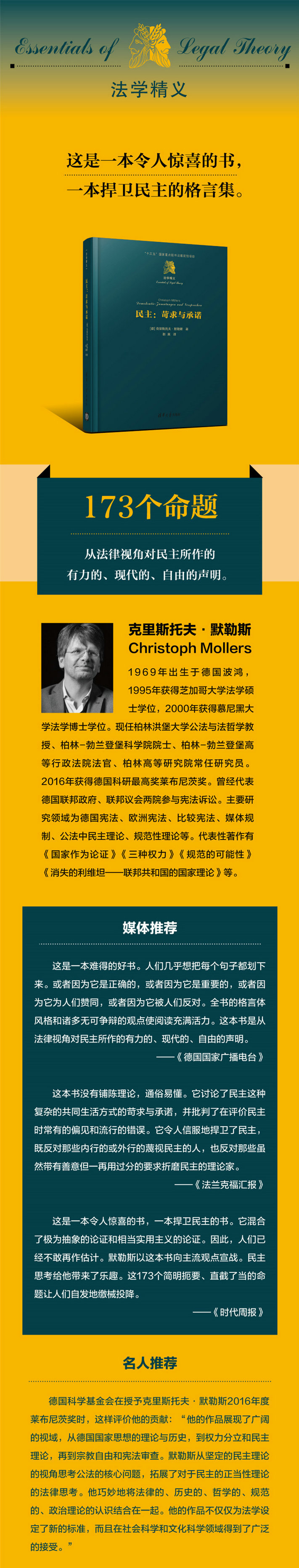 近日,我院趙真博士翻譯的《民主:苛求與承諾》由清華大學(xué)出版社出版。這本書被列入“十三五”國家重點(diǎn)圖書出版規(guī)劃項(xiàng)目“法學(xué)精義”系列,并由歌德學(xué)院(中國)提供翻譯資助。這本書的德文原著Demokratie - Zumutungen und Versprechen由2016年度萊布尼茨獎(jiǎng)得主、柏林洪堡大學(xué)公法與法哲學(xué)教授克里斯托夫•默勒斯(Christoph Möllers)撰寫。在這本書中,默勒斯以格言體的寫作方式討論了民主這種復(fù)雜的共同生活方式的苛求與承諾,并批判了在評價(jià)民主時(shí)常有的偏見和錯(cuò)誤。默勒斯在書中勾勒了民主的輪廓,闡明了民主的最小條件,呈現(xiàn)了民主的邊界與矛盾,不斷將讀者引入對民主問題的反省與沉思。
