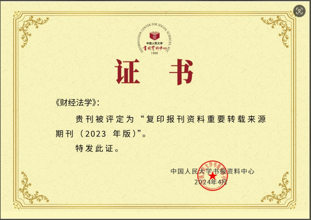 2024年4月25日,《復(fù)印報(bào)刊資料重要轉(zhuǎn)載來源期刊(2023年版)》正式發(fā)布,《財(cái)經(jīng)法學(xué)》成功入選。這是《財(cái)經(jīng)法學(xué)》繼2021年入選《復(fù)印報(bào)刊資料重要轉(zhuǎn)載來源期刊(2020年版)》后再次入選。