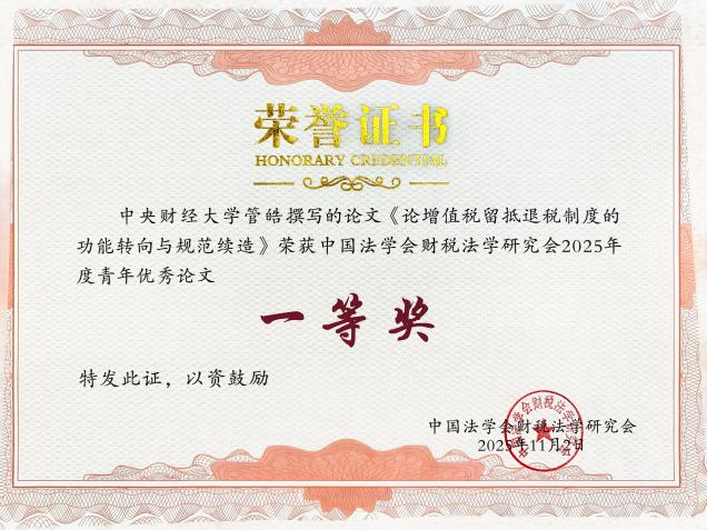 在本屆年會青年優(yōu)秀論文評選中,法學(xué)院碩士研究生管皓向大會提交的論文《論增值稅留抵退稅制度的功能轉(zhuǎn)向與規(guī)范續(xù)造》榮獲中國法學(xué)會財稅法學(xué)研究會2025年度青年優(yōu)秀論文一等獎。