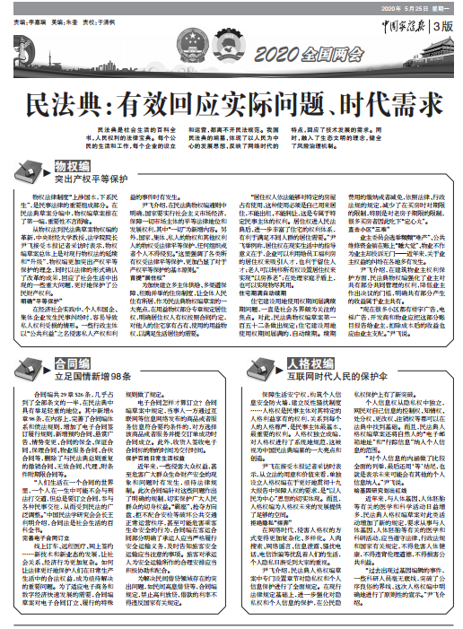 民法典是社會(huì)生活的百科全書,人民權(quán)利的法律寶典。每個(gè)公民的生活和工作,每個(gè)企業(yè)的設(shè)立和運(yùn)營,都離不開民法規(guī)范。我國民法典的編纂,體現(xiàn)了以人民為中心的發(fā)展思想,反映了網(wǎng)絡(luò)時(shí)代的特點(diǎn),回應(yīng)了技術(shù)發(fā)展的需求。同時(shí),融入了生態(tài)文明的理念,健全了風(fēng)險(xiǎn)治理機(jī)制。中央財(cái)經(jīng)大學(xué)教授、法學(xué)院院長尹飛接受《中國家庭報(bào)》采訪,分別對(duì)民法典物權(quán)編、合同編、人格權(quán)編的創(chuàng)新之處進(jìn)行了解讀。