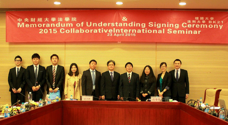 2015年4月23日,中央財經(jīng)大學(xué)法學(xué)院與韓國檀國大學(xué)合作協(xié)議簽訂暨學(xué)術(shù)研討會在我校學(xué)院南路校區(qū)學(xué)術(shù)會堂604會議室舉行。韓國檀國大學(xué)南基然教授及隨行三名研究員,我院副院長高秦偉教授、杜穎教授、董新義副教授、沈健博士、楊威老師及研究生、本科生代表共同出席了簽約儀式與研討會。簽約儀式與研討會由董新義副教授主持。