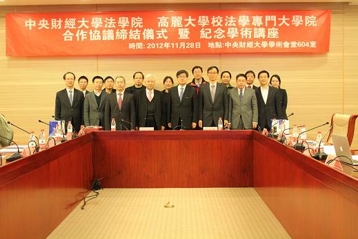 11月28日,中央財(cái)經(jīng)大學(xué)法學(xué)院與韓國高麗大學(xué)法學(xué)院學(xué)術(shù)交流與合作協(xié)議簽約儀式在我校學(xué)術(shù)會堂604會議室隆重舉行。郭鋒院長和高麗大學(xué)法學(xué)院樸魯馨院長分別代表雙方在協(xié)議上簽字。韓國駐華大使館知識產(chǎn)權(quán)參贊徐東旭博士出席了簽字儀式。