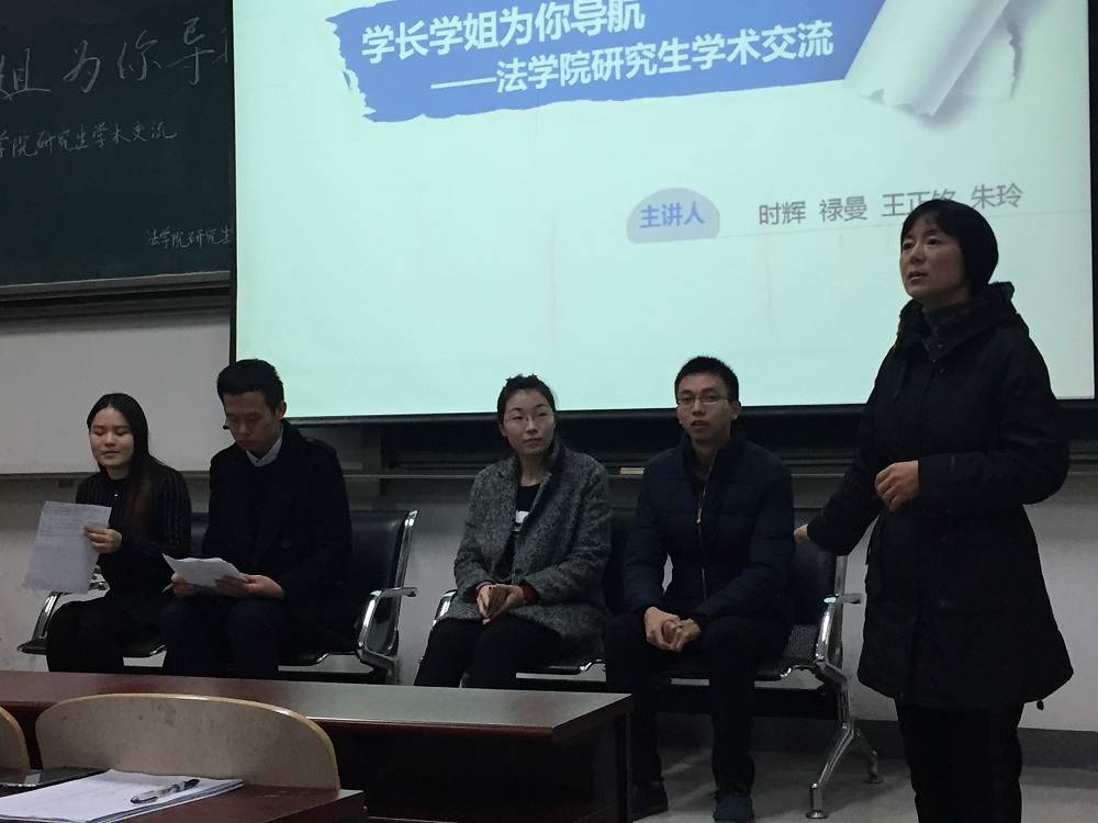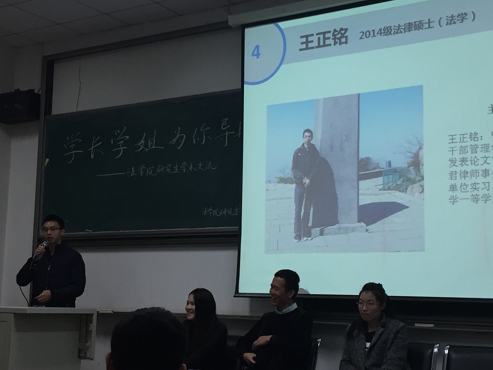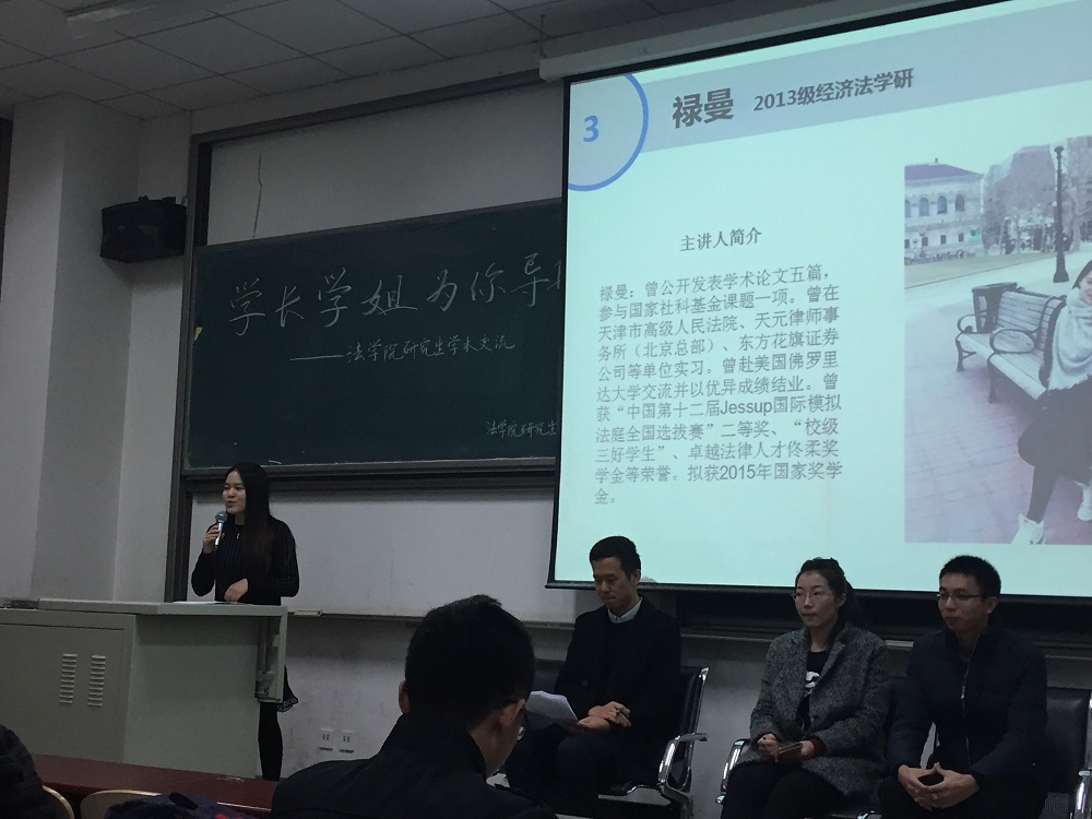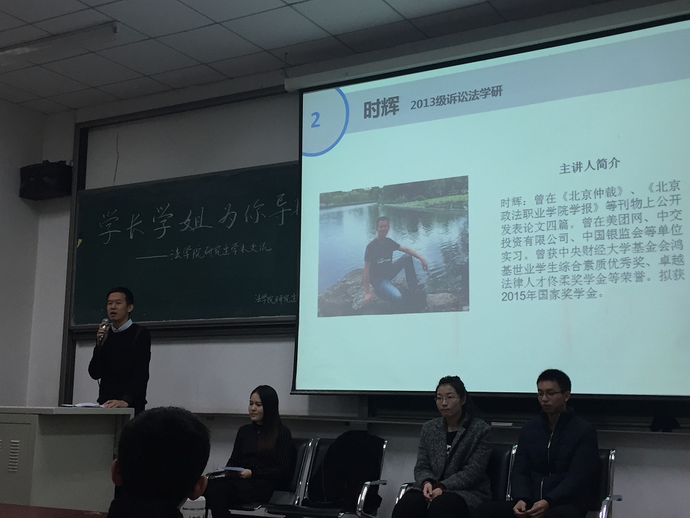 2015年11月19日上午8點(diǎn)30分,由法學(xué)院研究生會(huì)舉辦的“學(xué)長(zhǎng)學(xué)姐為你導(dǎo)航”系列活動(dòng)--研究生學(xué)術(shù)交流講座在沙河校區(qū)主教106舉行,蒙廣平老師參加了此次講座,并就學(xué)院獎(jiǎng)勵(lì)、學(xué)業(yè)獎(jiǎng)和國(guó)家獎(jiǎng)學(xué)金等的細(xì)則做了簡(jiǎn)單介紹,希望同學(xué)們?cè)趯W(xué)術(shù)科研方面投入更多些精力。此次講座的主講人包括13級(jí)經(jīng)濟(jì)法學(xué)研究生祿曼學(xué)姐、訴訟法學(xué)研究生時(shí)輝學(xué)長(zhǎng)、14級(jí)法律碩士(法學(xué))王正銘學(xué)長(zhǎng)以及13級(jí)法律碩士(非法學(xué))朱玲學(xué)姐。