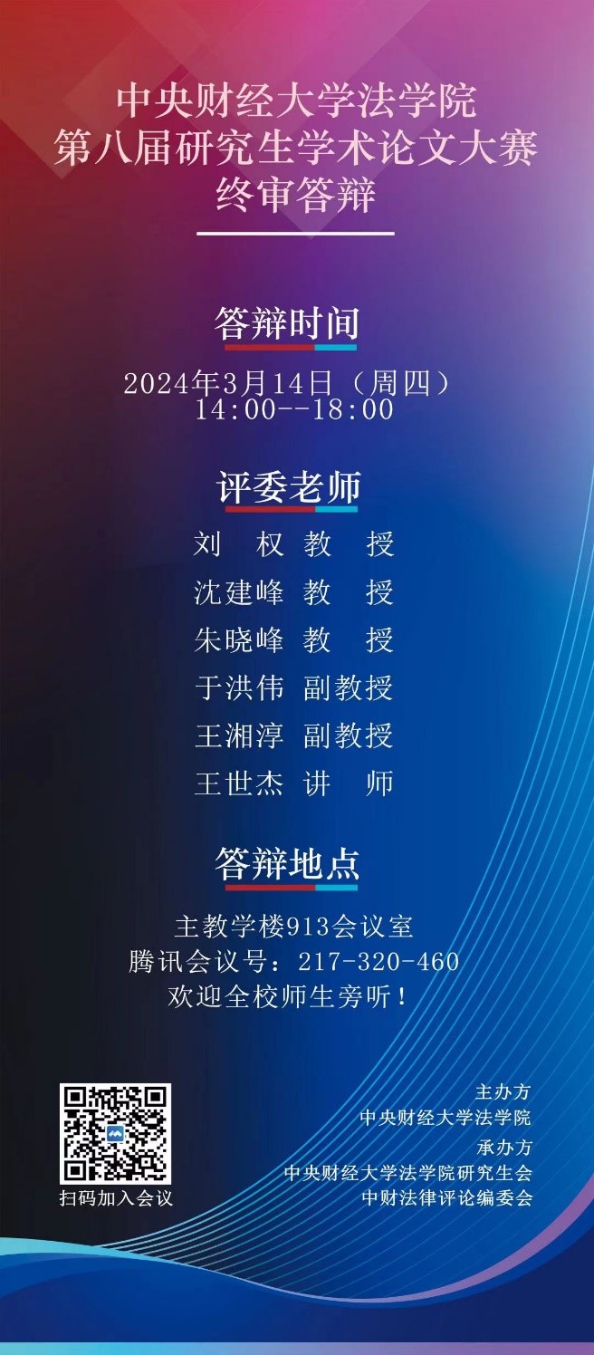 本活動由法學(xué)院研究生會和中財法律評論承辦,相關(guān)教師和《中財法律評論》編輯部分別負(fù)責(zé)校內(nèi)和校外論文的前期初審。