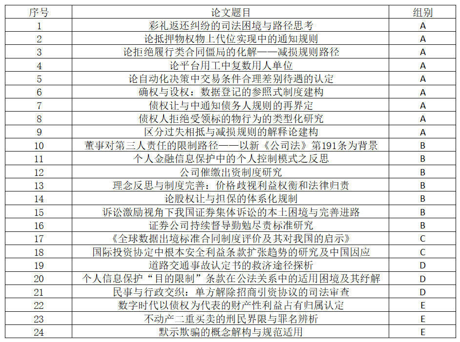 最終,經(jīng)過公平、公開、公正、科學(xué)的評審,最終共有24篇作品進(jìn)入終審答辯階段,其中A組9篇、B組7篇、C組2篇、D組3篇、E組3篇,具體名單詳見下圖,特此公告。