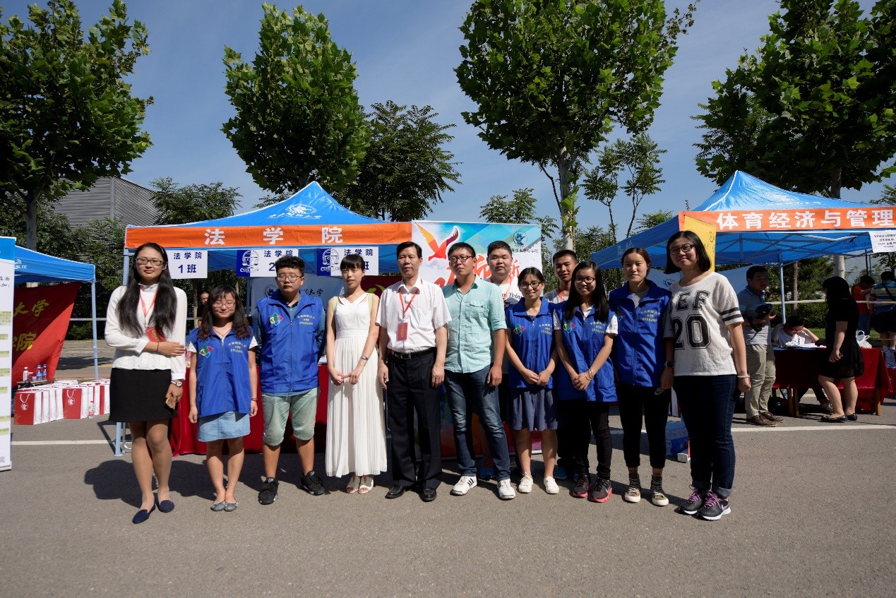 9月7日,天朗氣清,惠風(fēng)和暢。我院黨總支書記李巖老師、院長助理李偉老師、團(tuán)總支書記程曦老師、15級輔導(dǎo)員袁暉老師以及志愿者們、團(tuán)學(xué)骨干們在清晨的曙光中來到法學(xué)院迎新大本營,迎接新生的到來。