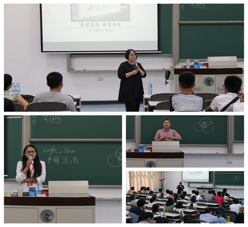 家長(zhǎng)會(huì)上,學(xué)院行政負(fù)責(zé)人吳韜老師首先向家長(zhǎng)們?cè)敿?xì)介紹了中財(cái)法學(xué)院的發(fā)展歷程,辦學(xué)特色,師資力量以及社會(huì)服務(wù)情況,闡釋了大學(xué)學(xué)習(xí)的特征。之后,院長(zhǎng)助理李偉老師和沈健老師分別就應(yīng)用復(fù)合型人才培養(yǎng)模式、涉外型人才培養(yǎng)模式,從培養(yǎng)目標(biāo)到培養(yǎng)措施進(jìn)行了細(xì)致地說(shuō)明。爾后黨總支書記李巖老師從學(xué)生在大學(xué)的任務(wù),大學(xué)的分流,學(xué)生在不同時(shí)期的特征表現(xiàn),中財(cái)法學(xué)的就業(yè)狀況以及對(duì)大學(xué)生家長(zhǎng)的建議等幾方面與家長(zhǎng)們進(jìn)行了經(jīng)驗(yàn)分享。最后,新生輔導(dǎo)員袁暉老師對(duì)家長(zhǎng)們提出了幾條建議,并留下了聯(lián)系方式。