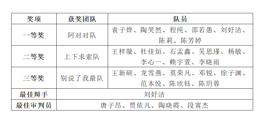 經(jīng)評(píng)委評(píng)議,辯護(hù)方“阿對(duì)對(duì)隊(duì)”斬獲第五屆模擬法庭大賽決賽一等獎(jiǎng),“上下求索隊(duì)”榮獲二等獎(jiǎng),劉妤潔同學(xué)榮獲“最佳辯手”稱(chēng)號(hào)。