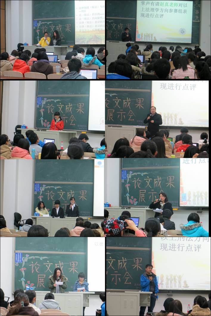 活動開始,主持人首先對出席老師進行介紹并表示誠摯的感謝,其次,主持人介紹了小組的出場順序以及活動細則。在接下來的活動過程中,各小組根據(jù)選題方向逐一上場進行成果展示,并在其間穿插了不同法律方向?qū)<业狞c評,點評主要強調(diào)了論文結(jié)構(gòu)、論文論證等方面出現(xiàn)的問題,同時也對參賽者積極嚴謹?shù)膽B(tài)度進行了表揚。在此輪的淘汰賽中,各個小組都全力以赴,展現(xiàn)了法學院學生的良好風采。本場活動中各組激烈的角逐激發(fā)了參賽者對此活動的熱情,同時也把本次大會推向了高潮。最后,主持人對點評老師的蒞臨再次表示感謝,并宣布此次晉級名單將在公郵宣布,祝愿各小組取得好成績,論文成果展示會就此圓滿落下帷幕。