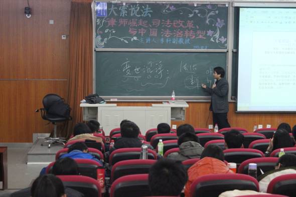 關(guān)于中國司法改革與法治轉(zhuǎn)型,李軒副教授主要以當(dāng)前律師業(yè)的崛起為視角為同學(xué)們做出解釋。李軒副教授談到律師業(yè)的崛起是一個十分漫長的過程:從訟師到律師是中國法制發(fā)展的行業(yè)映射;在北洋政府時期、民國中心時期,民國立法與律師業(yè)興起;新中國律師業(yè)在改革開放過程中發(fā)展的波折與正軌,在改革開放三十年中,律師作用開始凸顯并持續(xù)向好的方向發(fā)展。