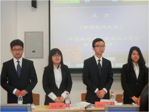 4月13日下午1點30分,我院辯論隊與中國政法大學行政法學院辯論隊的比賽在北京林業(yè)大學舉行。本次比賽邀請了北京林業(yè)大學的幾位優(yōu)秀辯手擔任評委。我院辯論隊派出了2012級的沈明杰、劉潔同學和2013級的李思澄、萬盾斌同學參加比賽。