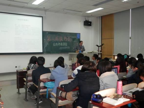 隨后,胡曉珂副教授還向同學(xué)們大致地介紹了自己的讀書經(jīng)歷,通過PPT的形式詳細(xì)地向大家介紹了《論法的精神》、《正義論》、《法律哲學(xué)與法律方法》、《法律的故事》、《西窗法雨》、《法律思維與民法實(shí)例:請(qǐng)求權(quán)基礎(chǔ)理論體系》、《英美法講座》、《通往奴役之路》、《鄉(xiāng)土中國(guó)生育制度 鄉(xiāng)土重建》、《近距離看美國(guó)》、《一個(gè)村莊里的中國(guó)》、《思想國(guó)》、《政法筆記》等書,并推薦同學(xué)們?cè)诒究破陂g多閱讀這類書籍,提升自我法律修養(yǎng)。