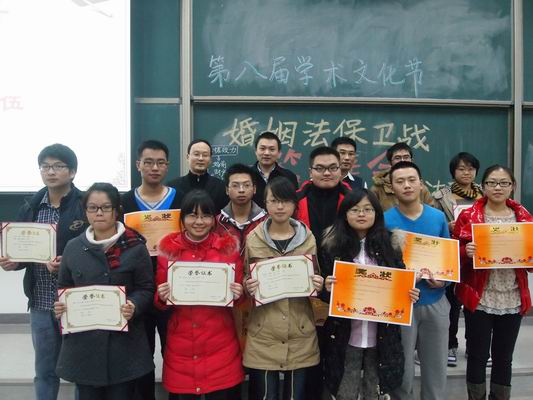 小組答辯由3至4人上臺陳述時間約為3分鐘,接下來由老師就論文內(nèi)容進行提問時間約為8分鐘。經(jīng)過老師專業(yè)的點評及細致提問,使參賽選手們透徹的明白了自己論文的優(yōu)點及不足。通過參賽選手們妙語連珠的回答,使得在場的觀眾加深了對婚姻法司法解釋三的理解。活動最后經(jīng)過老師精心的討論評出了一等獎一名為冉烺小組,二等獎是兩名胡銀燕組及韋沛雨組,三等獎三名是朱利軍組、李偉組及于梓萌組,并評出了優(yōu)秀獎6組。在活動的最后老師與獲獎選手們一起合影留念。