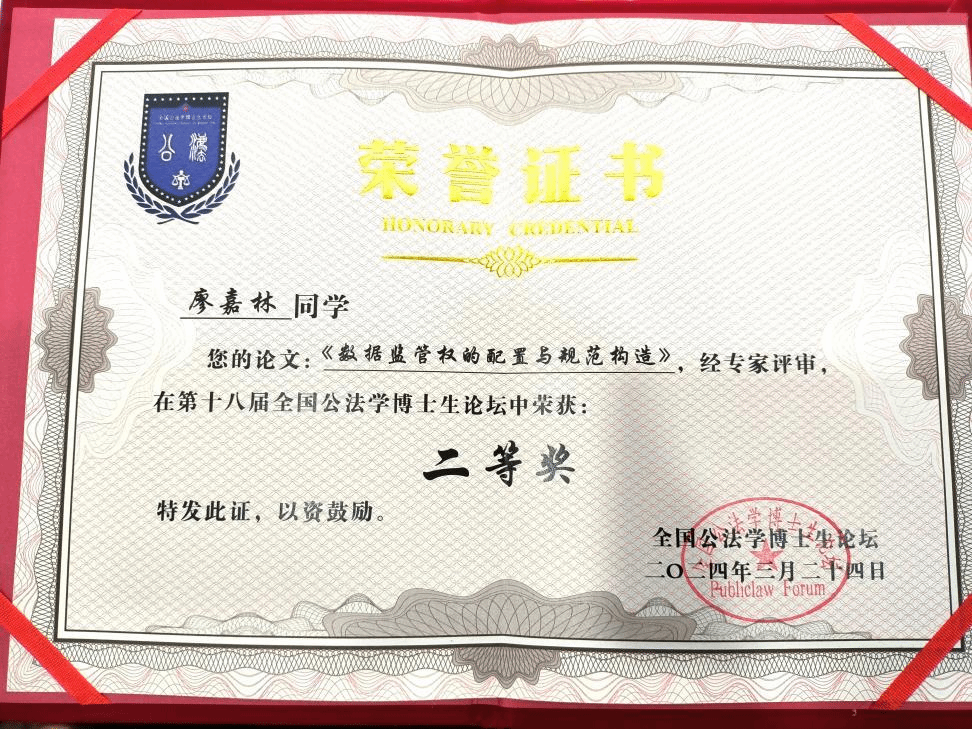 2024年3月23日-24日,第十八屆全國(guó)公法學(xué)博士生論壇在蘇州大學(xué)舉辦。本次論壇由蘇州大學(xué)王健法學(xué)院主辦,《蘇州大學(xué)學(xué)報(bào)(法學(xué)版)》編輯部承辦,江蘇圣典(常州)律師事務(wù)所協(xié)辦。來(lái)自中央財(cái)經(jīng)大學(xué)、北京大學(xué)、清華大學(xué)、中國(guó)人民大學(xué)、浙江大學(xué)、上海交通大學(xué)、山東大學(xué)、東南大學(xué)、武漢大學(xué)、吉林大學(xué)、廈門(mén)大學(xué)、南開(kāi)大學(xué)、中山大學(xué)、中國(guó)政法大學(xué)、中南財(cái)經(jīng)政法大學(xué)、鄭州大學(xué)、西南政法大學(xué)、華東政法大學(xué)、中國(guó)人民公安大學(xué)、蘇州大學(xué)等高校的20位專(zhuān)家學(xué)者和30余位公法學(xué)博士生參加論壇。我院劉權(quán)教授指導(dǎo)的2023級(jí)博士生廖嘉林同學(xué)應(yīng)邀參加論壇并獲二等獎(jiǎng)。廖嘉林同學(xué)參會(huì)獲得中央財(cái)經(jīng)大學(xué)研究生學(xué)術(shù)交流支持計(jì)劃的資助。