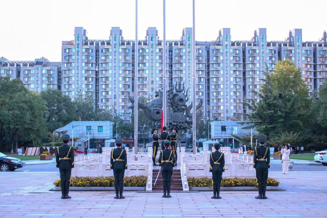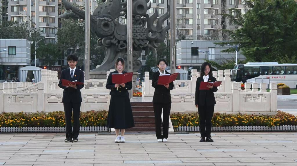 日出東方,叩啟蒼穹。上午七點(diǎn)整,升旗儀式正式開始。中央財(cái)經(jīng)大學(xué)國(guó)旗護(hù)衛(wèi)隊(duì)護(hù)旗手們目光如炬,他們以標(biāo)準(zhǔn)的軍姿、堅(jiān)定的步伐,護(hù)送五星國(guó)旗至旗桿下。隨后,伴隨著莊嚴(yán)的國(guó)歌,五星紅旗冉冉升起,迎風(fēng)舒展。全體師生肅立行注目禮,齊聲高唱國(guó)歌,每個(gè)人的心中都涌動(dòng)著對(duì)祖國(guó)的崇高敬意和無(wú)限熱愛(ài)。