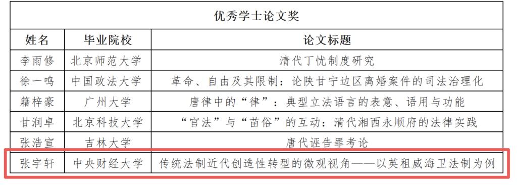近日,中國(guó)人民大學(xué)曾憲義先生法律史獎(jiǎng)學(xué)金理事會(huì)公布了第七屆曾憲義先生法律史獎(jiǎng)學(xué)金評(píng)選結(jié)果,我院鄧建鵬教授指導(dǎo)2021級(jí)本科生張宇軒同學(xué)完成“英租威海衛(wèi)法制”主題研究的畢業(yè)論文榮獲“優(yōu)秀學(xué)士論文獎(jiǎng)”。本屆獎(jiǎng)學(xué)金評(píng)選在全國(guó)范圍內(nèi)收到參評(píng)論著百余項(xiàng),共有22項(xiàng)論著入選,其中“優(yōu)秀學(xué)士論文獎(jiǎng)”共6項(xiàng)。