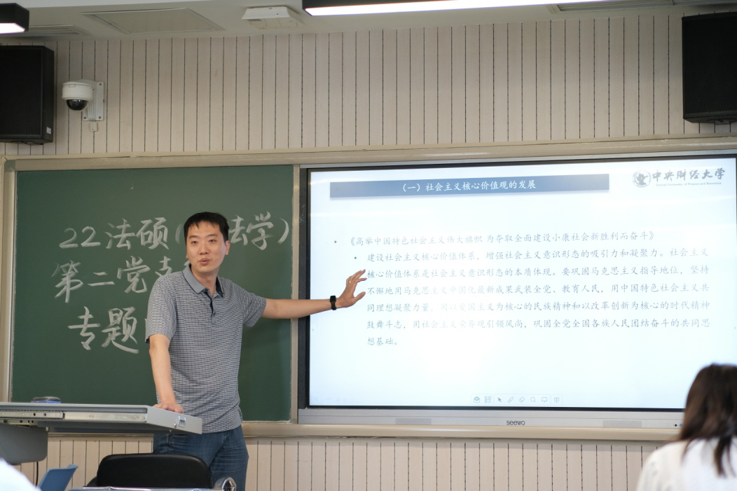 2023年5月22日,為深入學(xué)習(xí)貫徹習(xí)近平新時(shí)代中國特色社會主義思想,副院長殷秋實(shí)為22法碩(非法學(xué))第二黨支部的全體黨員講授了題為“社會主義核心價(jià)值觀與《民法典》”的專題黨課。
