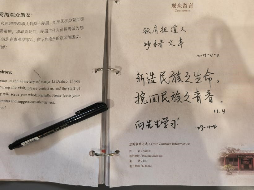 在革命事跡陳列室內(nèi),黨員們無不震撼于李大釗同志短暫但光輝的一生:年少立志、法政六年,鐵肩道義、引領(lǐng)潮流,堅(jiān)定信仰、矢志搏火,英勇就義、功勛永存。參觀完畢,黨員們備受李大釗精神的鼓舞,在留言本上寫下“新造民族之生命,挽回民族之青春”“向先生學(xué)習(xí)!”等留言。