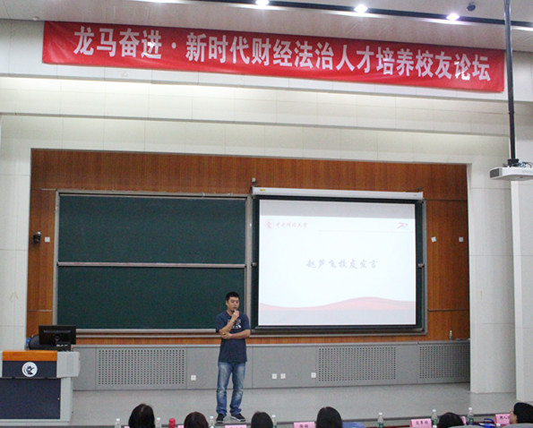 我院2001級校友趙蘆飛作為校友代表發(fā)言,他首先感謝了學校和學院對自己的培養(yǎng)。其次結合自己在銀行多年的工作經驗對法學院人才培養(yǎng)提出了四點建議,包括加強本科生教育、強化對學生的就業(yè)指導、繼續(xù)加強培養(yǎng)應用復合型人才和加強對學生法律實務的培養(yǎng)。最后,趙蘆飛校友由衷地表示,自己作為一名中財人,感到很驕傲,并且希望自己的孩子以后也能夠成為一名中財人,也祝學校和學院未來發(fā)展得越來越好。