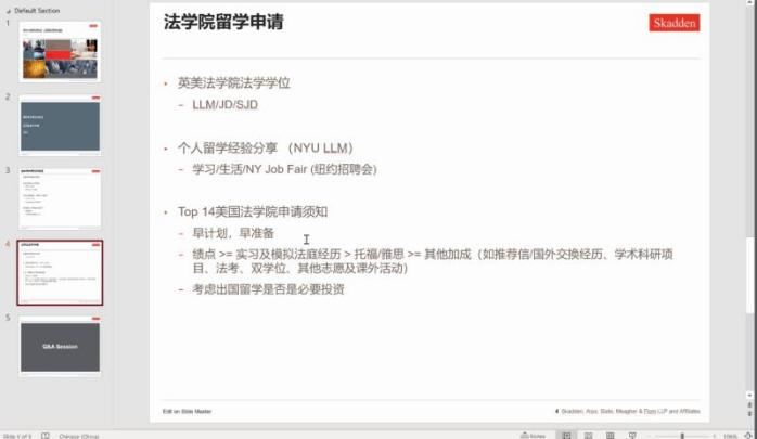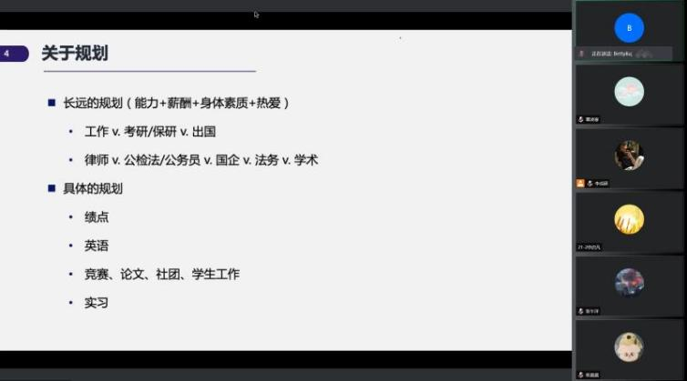 最后,安然校友就同學(xué)們的未來發(fā)展,重點說明了法科學(xué)生留學(xué)申請所要注意的問題。她向同學(xué)們推薦了幾所英美法學(xué)院,并結(jié)合自己的留學(xué)經(jīng)驗,從學(xué)習(xí)、生活和招聘會等多方面進行分享。同時,安然校友建議同學(xué)們盡早為自己的未來發(fā)展方向做出計劃和準(zhǔn)備,鼓勵大家著眼于未來,好好規(guī)劃自己的人生道路。