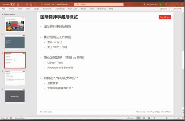 隨后,安然校友也向同學(xué)們分享了自身的發(fā)展經(jīng)歷以及心路歷程。在執(zhí)業(yè)領(lǐng)域和就職體驗方面,她介紹了“007”工作制的存在原因以及利弊,使同學(xué)們更直觀了解到涉外律師的生活;在職業(yè)發(fā)展路徑方面,她簡要概括了英所和美所各自的優(yōu)勢與要求,幫助同學(xué)們提早規(guī)劃職業(yè)選擇。