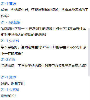 在最后提問環(huán)節(jié),同學(xué)們積極參與,踴躍發(fā)言,分別從工作領(lǐng)域、學(xué)習(xí)要求、政策區(qū)別、身份規(guī)定等方面提出自己的困惑。常思煜、李佳校友結(jié)合自身工作與學(xué)習(xí)經(jīng)驗(yàn)予以充分詳盡地回應(yīng),使同學(xué)們對(duì)選調(diào)生的成長(zhǎng)有了更深入的了解。