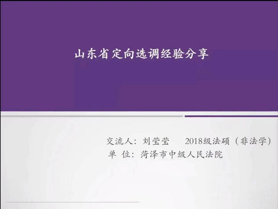 第二位分享人是2021屆法律(非法學(xué))專業(yè)畢業(yè)生劉瑩瑩學(xué)姐,選調(diào)于菏澤市中院。在前一位偉杰學(xué)姐分享的基礎(chǔ)上,瑩瑩學(xué)姐在選崗和備考兩個(gè)方面補(bǔ)充。