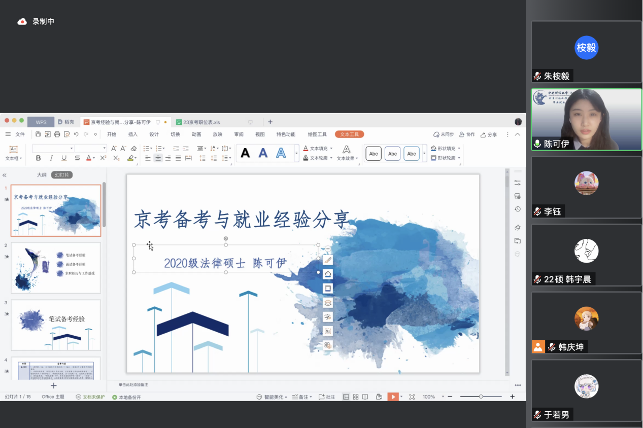 2022年11月20日晚,中央財(cái)經(jīng)大學(xué)法學(xué)院“新生引航系列講座·畢業(yè)就業(yè)分享會(huì)”京考法院專場(chǎng)講座在線上成功舉辦。在京考公告正式發(fā)布的當(dāng)天,學(xué)院特邀李鈺、傅一鳴、于若男、陳可伊四位今年通過京考入職法院的優(yōu)秀畢業(yè)生進(jìn)行經(jīng)驗(yàn)分享。法學(xué)院黨委副書記徐穎研究員、副院長(zhǎng)李偉副教授和2022級(jí)研究生輔導(dǎo)員李紫儀老師出席本次活動(dòng),活動(dòng)由2022級(jí)法律碩士研究生韓宇晨主持,共計(jì)250余名法學(xué)院同學(xué)參加。
