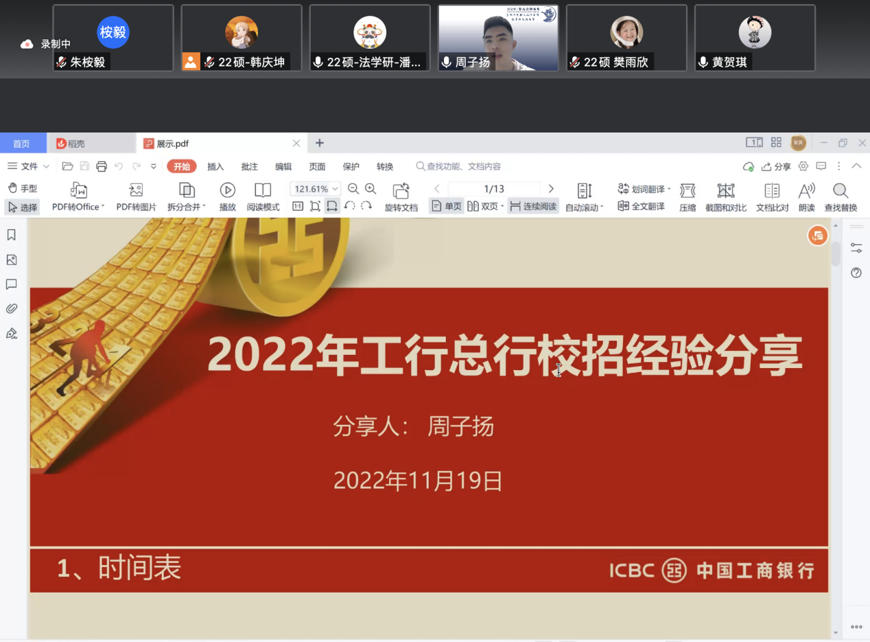 周子揚(yáng)學(xué)長(zhǎng)是2022屆法律碩士(法學(xué))專業(yè)畢業(yè)生,現(xiàn)就職于中國(guó)工商銀行總行,學(xué)長(zhǎng)主要從備考安排、筆面試經(jīng)驗(yàn)、職業(yè)發(fā)展三個(gè)方面進(jìn)行經(jīng)驗(yàn)分享。