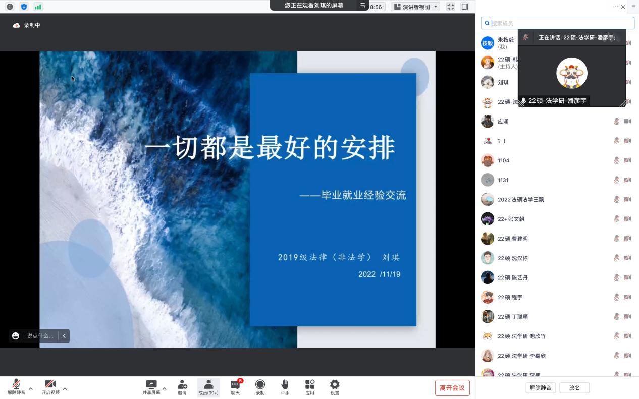 中央財(cái)經(jīng)大學(xué)法學(xué)院“新生引航系列講座·畢業(yè)就業(yè)分享會(huì)”金融機(jī)構(gòu)專場(chǎng)講座于2022年11月19日在線上順利舉行。學(xué)院特邀劉琪、應(yīng)涌、黃賀琪、周子揚(yáng)、周遠(yuǎn)洋五位2022屆畢業(yè)生作為本次分享會(huì)的嘉賓。法學(xué)院黨委副書記徐穎研究員、副院長(zhǎng)李偉副教授、2022級(jí)研究生輔導(dǎo)員李紫儀老師出席本次活動(dòng),講座由2022級(jí)法學(xué)碩士研究生潘彥宇同學(xué)主持,共計(jì)280余名同學(xué)參加。