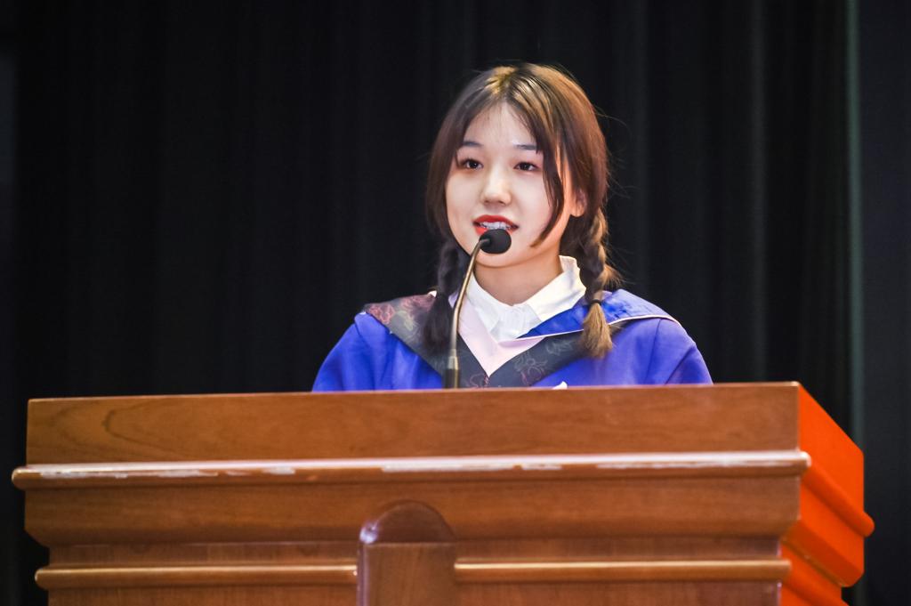 我是中央財經大學法學院2018級憲法學與行政法學研究生、2014級本科生王姝。十分榮幸今天能夠作為畢業(yè)生代表之一,站在這個光榮而美麗的舞臺上。