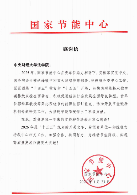 近日,國家節(jié)能中心向我院發(fā)來感謝信,對我院教師郭維真副教授在節(jié)約能源法修訂、節(jié)能激勵機(jī)制專題研究工作中給予的支持表示感謝。