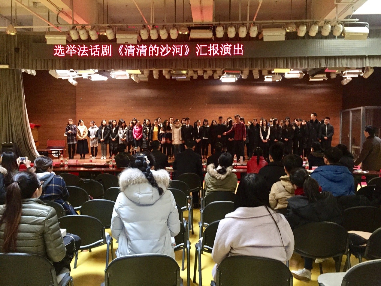 2016年12月18日上午9點(diǎn),我院2015級(jí)《選舉法》課程話劇《清清的沙河》在沙河校區(qū)大學(xué)生活動(dòng)中心的金廳成功上演。選修《選舉法》課程的我院2015級(jí)102名同學(xué)自編、自導(dǎo)并自演了本場(chǎng)話劇。