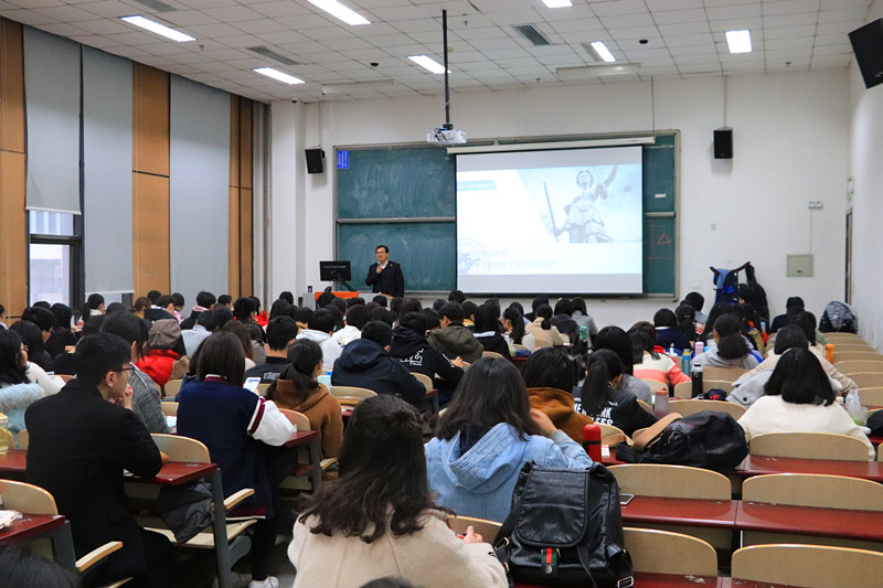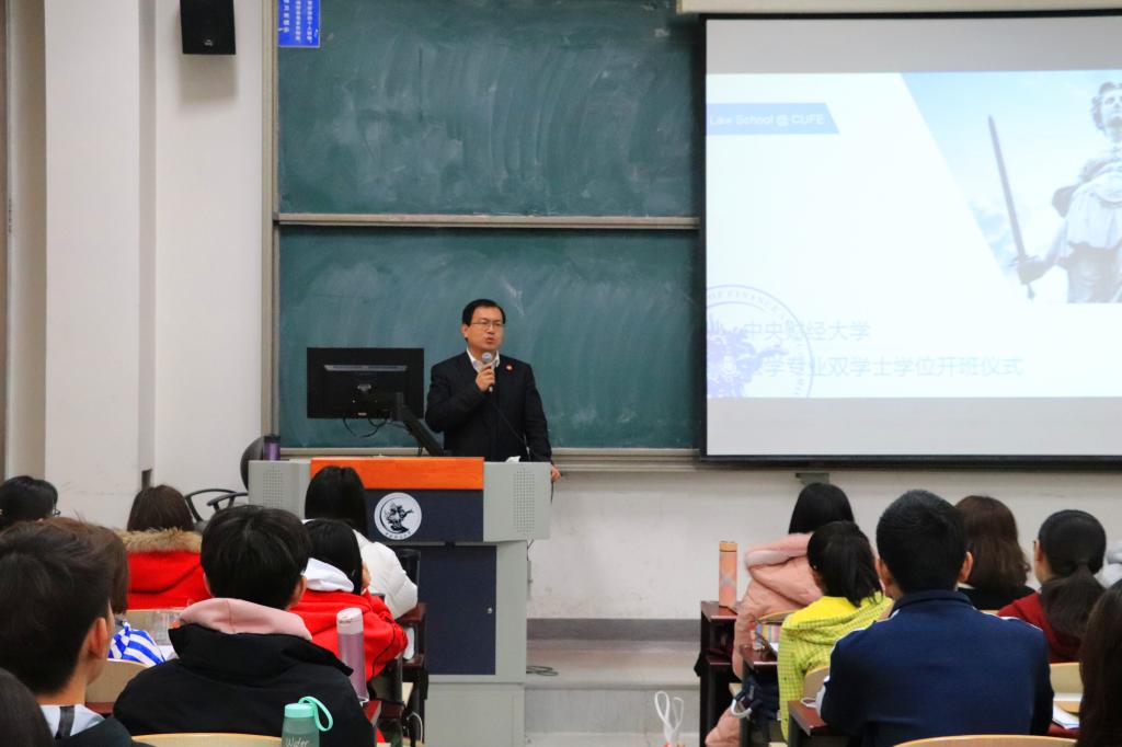 尹飛院長首先對雙學(xué)位新生的到來表示熱烈歡迎,隨后從法學(xué)院和雙學(xué)位項目的發(fā)展歷程、辦學(xué)初衷、對學(xué)生的要求和期盼等方面進行了講述。他指出,我院不忘教學(xué)育人的初心,順應(yīng)新時代的要求,在2017年重啟雙學(xué)位項目,致力于為社會各界尤其是財經(jīng)界培養(yǎng)更多兼具法學(xué)知識、風(fēng)險防范意識和法治意識的應(yīng)用型、復(fù)合型人才。經(jīng)過雙學(xué)位項目的培養(yǎng),同學(xué)們可以系統(tǒng)地學(xué)習(xí)法律專業(yè)知識,培養(yǎng)法律思維和法律信仰。他希望同學(xué)們在認(rèn)真學(xué)習(xí)法學(xué)課程的同時,提高對法治事件的敏感度,對各類社會現(xiàn)象更多地從法律層面進行分析和思考。他還希望同學(xué)們能夠充分利用法學(xué)院的資源,做好與自己專業(yè)的融合,把握學(xué)習(xí)機會,發(fā)揚個性,保持好奇心,充分完善自己的人格。