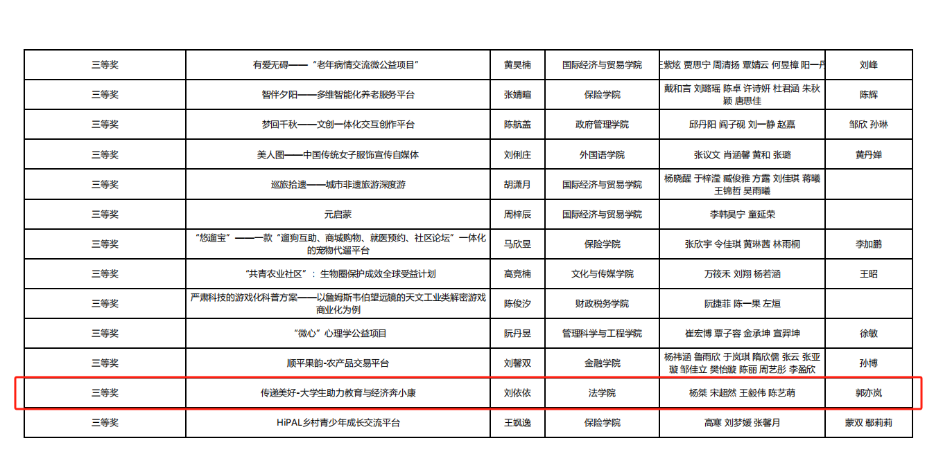 2024年6月28日,2024年中央財經(jīng)大學(xué)創(chuàng)新創(chuàng)業(yè)大賽獲獎結(jié)果出爐。我院23級本科生劉依依為負責(zé)人的“傳遞美好—大學(xué)生助力教育與經(jīng)濟奔小康”項目獲評三等獎。
