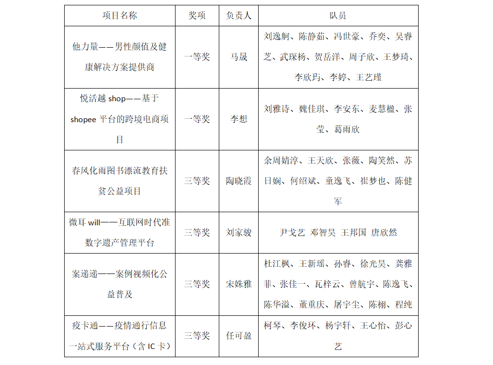 2022年6月9日,第八屆中國(guó)國(guó)際“互聯(lián)網(wǎng)+”大學(xué)生創(chuàng)新創(chuàng)業(yè)大賽中央財(cái)經(jīng)大學(xué)選拔賽圓滿結(jié)束。我院本次比賽中斬獲佳績(jī),有兩個(gè)項(xiàng)目榮獲一等獎(jiǎng)、四個(gè)項(xiàng)目榮獲三等獎(jiǎng),周游副教授獲評(píng)優(yōu)秀指導(dǎo)教師,其中“他力量——男性顏值及健康解決方案提供商”獲得主賽道研究生創(chuàng)意組一等獎(jiǎng);“悅活越shop——基于shopee平臺(tái)的跨境電商項(xiàng)目”獲得主賽道本科生初創(chuàng)組一等獎(jiǎng);“春風(fēng)化雨圖書(shū)漂流教育扶貧公益項(xiàng)目”、“微耳will——互聯(lián)網(wǎng)時(shí)代準(zhǔn)數(shù)字遺產(chǎn)管理平臺(tái)”、“案遞遞——案例視頻化公益普及”、“疫卡通——疫情通行信息一站式服務(wù)平臺(tái)(含IC卡)”均獲得主賽道本科生創(chuàng)意組三等獎(jiǎng)。兩個(gè)一等獎(jiǎng)項(xiàng)目將代表中央財(cái)經(jīng)大學(xué)角逐省賽。