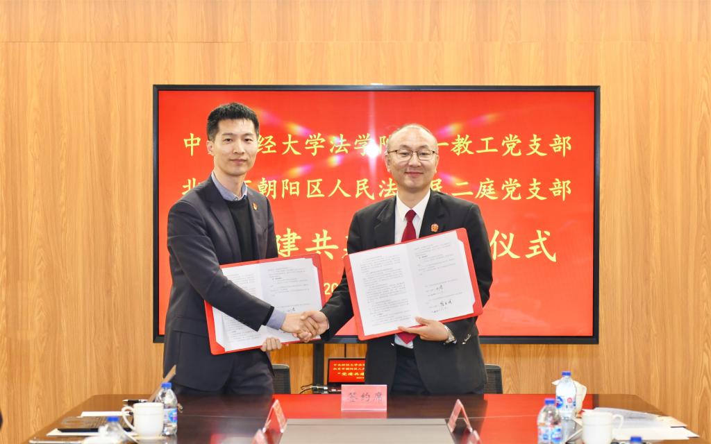 隨后,徐東主任和徐穎副書記分別就朝陽區(qū)人民法院民二庭黨支部、中央財(cái)經(jīng)大學(xué)法學(xué)院第一教工黨支部的相關(guān)情況予以介紹。徐穎副書記在講話中指出,本次座談也是學(xué)院“訪企拓崗”的一項(xiàng)重要活動(dòng),希望未來可以建立更加良好的實(shí)習(xí)生遴選和輸送機(jī)制,助力法學(xué)院畢業(yè)生高質(zhì)量就業(yè)。在雙方的見證下,朝陽區(qū)人民法院民二庭黨支部書記、庭長崔立斌和中央財(cái)經(jīng)大學(xué)法學(xué)院第一教工黨支部書記武騰簽署黨支部黨建共建協(xié)議。