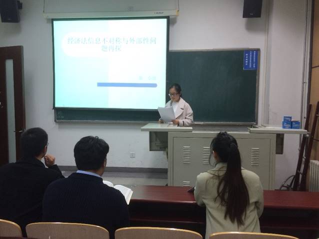 首先,高天同學(xué)介紹了本次活動(dòng)的主題為“經(jīng)濟(jì)法信息不對(duì)稱與外部性問(wèn)題再探”,活動(dòng)分三個(gè)部分依次進(jìn)行,第一,專題報(bào)告人向小組成員匯報(bào)文獻(xiàn)綜述撰寫(xiě)情況;第二,小組成員就本次活動(dòng)主題進(jìn)行討論交流;第三,小組組長(zhǎng)進(jìn)行總結(jié)發(fā)言。