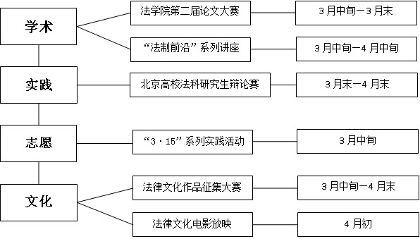 計(jì)劃于3月14日舉辦“法律文化月”開幕式活動(dòng),屆時(shí)將邀請(qǐng)學(xué)院相關(guān)領(lǐng)導(dǎo)出席并講話,邀請(qǐng)首都各高校法學(xué)院研究生會(huì)代表參加。