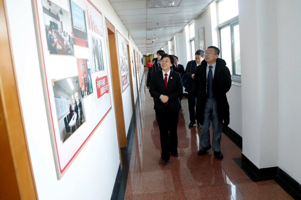 簽約儀式開始前,我院書記吳韜教授一行在平谷法院黨組書記、院長李艷紅等同志的陪同下,一道參觀了平谷法院院史展、家事糾紛調(diào)解室、物業(yè)糾紛調(diào)解室、少年法庭及“不忘初心擔(dān)使命、忠誠為民鑄法魂”建院70周年主題展等,領(lǐng)略了平谷法院獨具特色的文化氛圍及若干具有前瞻性的改革舉措。