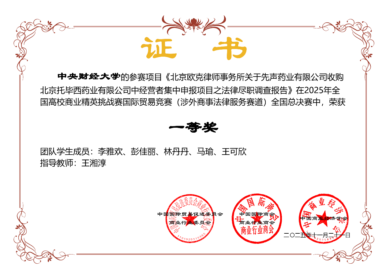 在學(xué)院教師指導(dǎo)下,學(xué)生廣泛參與涉外類學(xué)科專業(yè)競賽。2025年,獲全國高校商業(yè)精英挑戰(zhàn)賽國際貿(mào)易競賽(涉外商事法律服務(wù)賽道)2項(xiàng)一等獎(jiǎng)、1項(xiàng)二等獎(jiǎng)以及1項(xiàng)三等獎(jiǎng),第十四屆“中國WTO模擬法庭比賽”三等獎(jiǎng),第十七屆法蘭克福投資仲裁模擬法庭貿(mào)仲中國(內(nèi)地)賽區(qū)預(yù)選賽循環(huán)賽最佳辯手等多個(gè)全國性重要涉外法治競賽獎(jiǎng)項(xiàng)。