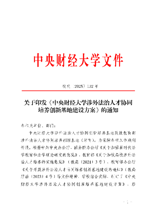 中央財(cái)經(jīng)大學(xué)2024年獲批教育部、中央依法治國辦涉外法治人才協(xié)同培養(yǎng)創(chuàng)新基地。2025年,學(xué)校及法學(xué)院持續(xù)加強(qiáng)基地建設(shè),涉外法治人才培養(yǎng)工作取得一系列新成績。