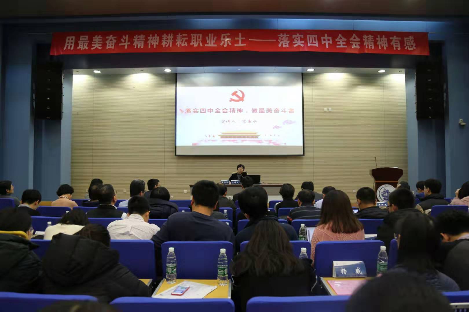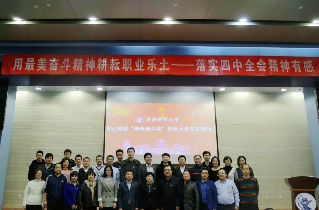 2019年12月9日晚,“最美奮斗者”、北京市學(xué)習(xí)貫徹黨的十九屆四中全會(huì)精神宣講團(tuán)成員宋魚水同志蒞臨中央財(cái)經(jīng)大學(xué),在學(xué)術(shù)會(huì)堂402報(bào)告廳為師生帶來(lái)“落實(shí)四中全會(huì)精神,做最美奮斗者”的主題宣講。法學(xué)院教師黨員三十余人和學(xué)生黨員、學(xué)生干部三百余人參加活動(dòng)。