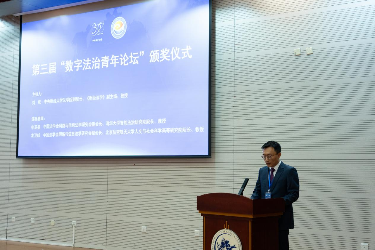 開幕式后,論壇舉行優(yōu)秀論文頒獎儀式。中央財經(jīng)大學法學院副院長劉權教授主持儀式,中國法學會網(wǎng)絡與信息法學研究會副會長、清華大學智能法治研究院院長申衛(wèi)星教授,中國法學會網(wǎng)絡與信息法學會副會長、北京航空航天大學人文與社會科學高等研究院院長龍衛(wèi)球教授,中國法學會網(wǎng)絡與信息法學研究會副會長、中國政法大學王立梅教授及《財經(jīng)法學》主編、中央財經(jīng)大學法學院邢會強教授為獲獎代表頒獎。