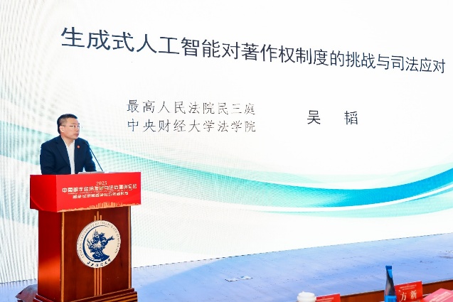 最高人民法院民三庭副庭長、中央財經(jīng)大學(xué)教授吳韜發(fā)表題為《生成式人工智能對著作權(quán)制度的挑戰(zhàn)與司法應(yīng)對》的演講。他指出,生成式人工智能對著作權(quán)制度的主要挑戰(zhàn)包括三個方面,即人工智能的主體性問題、人工智能生成物的可版權(quán)性,以及與生成式人工智能有關(guān)的侵權(quán)爭議。他結(jié)合人民法院審理的相關(guān)典型案件,介紹了近年來司法審判在應(yīng)對相關(guān)挑戰(zhàn)中所作的有益探索和努力。