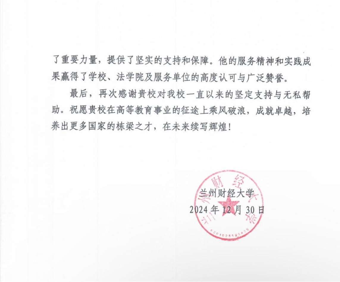 董新義老師于2023年9月赴蘭州財(cái)經(jīng)大學(xué)法學(xué)院開(kāi)展援建工作,并克服困難延長(zhǎng)半年服務(wù)期于2024年12月底返回學(xué)院工作,選派其援建蘭州財(cái)經(jīng)大學(xué)法學(xué)院是我院落實(shí)學(xué)校與蘭州財(cái)經(jīng)大學(xué)《對(duì)口支援協(xié)議》的具體舉措。今后,我院將繼續(xù)堅(jiān)持服務(wù)推進(jìn)東中西部高校協(xié)作、推動(dòng)西部高等教育高質(zhì)量發(fā)展和服務(wù)構(gòu)建新發(fā)展格局的國(guó)家戰(zhàn)略,堅(jiān)決貫徹落實(shí)教育部和學(xué)校關(guān)于對(duì)口支援西部地區(qū)高等學(xué)校的工作部署,多方面、多層次、持續(xù)性地支持蘭州財(cái)經(jīng)大學(xué)等西部兄弟院系的發(fā)展,為我國(guó)東西部高等法學(xué)教育的同步發(fā)展繼續(xù)作出貢獻(xiàn)。