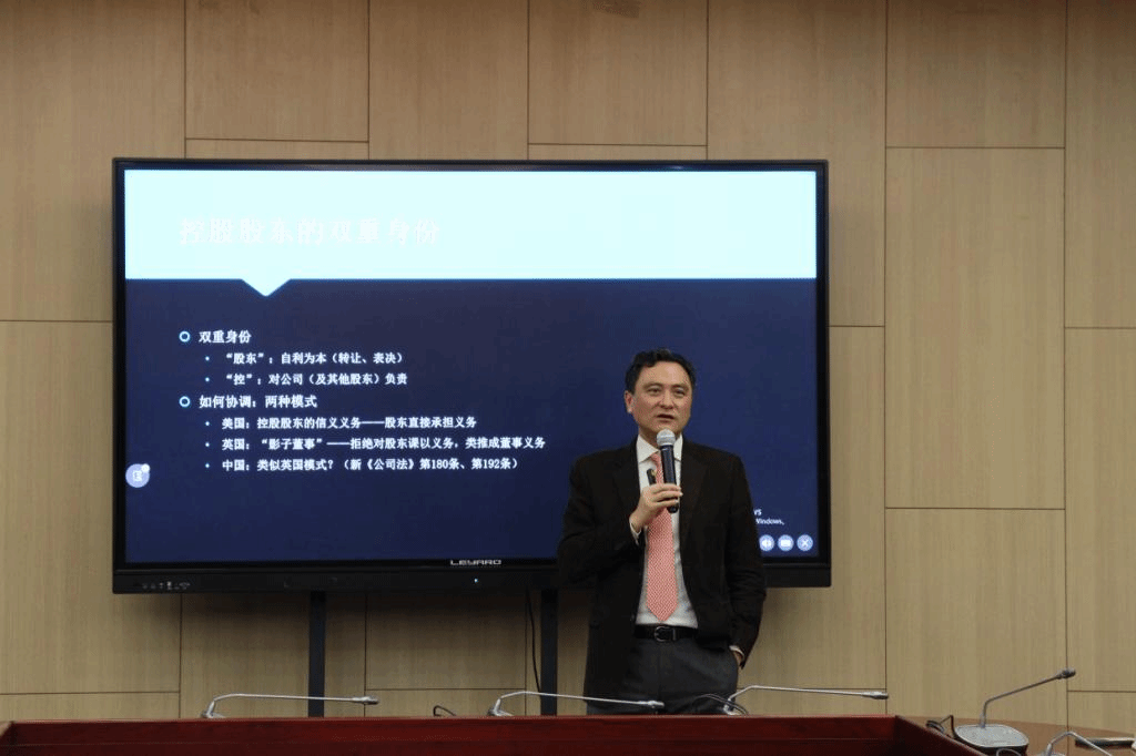 邢會強教授對張巍教授在法學領域的成就進行介紹,對其到來表示熱烈歡迎。張巍教授就控股股東的雙重身份進行討論,指出控股股東不僅以自身利益為本,還需對公司及其他股東負責。在此基礎上導致的利益沖突有兩種協(xié)調模式,美國模式強調由股東直接承擔義務,而英國模式更注重對影子董事的規(guī)制。就新《公司法》第180條及192條來看我國更類似于英國模式。