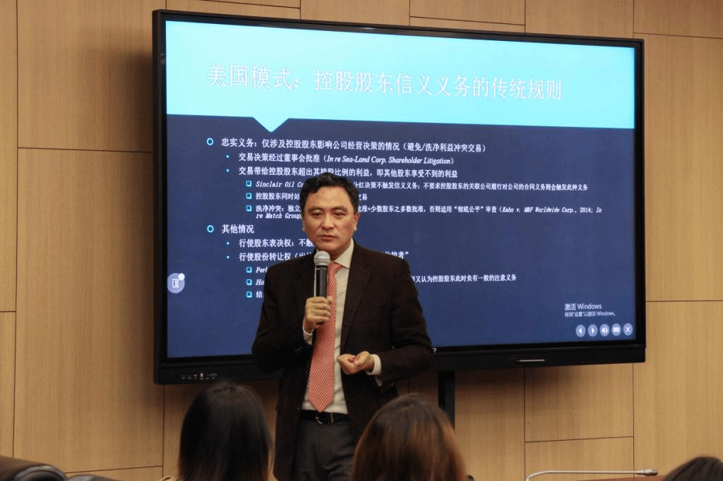張巍教授就美國模式進行更為詳細的說明,分別介紹了傳統(tǒng)規(guī)制下的延續(xù)及發(fā)展。在介紹控股股東的忠實義務時,引入了洗凈沖突規(guī)則。張巍教授認為美國模式下對該義務的傳統(tǒng)規(guī)制存在瑕疵,特定情況下控股股東的謹慎義務反超董事,且不能被豁免。在最新的In re Sears一案中,對控股股東的行動采二分法判斷標準,分別判定經(jīng)由董事會的行動及行使股東權利的行動,前者依舊采用洗凈規(guī)則,但后者根據(jù)其對“現(xiàn)狀”的影響分別采行為標準和審查標準,其中的雙叉測試法是其重點。隨后,他對英國模式中的影子董事展開分析,將影子董事與事實董事進行區(qū)分,指出在對特定的法律事實進行分析時,通常會進行穿透式的調查以確定真正責任主體。就上述內容,張巍教授還一并討論了英美模式下控股股東信義義務的異同點。