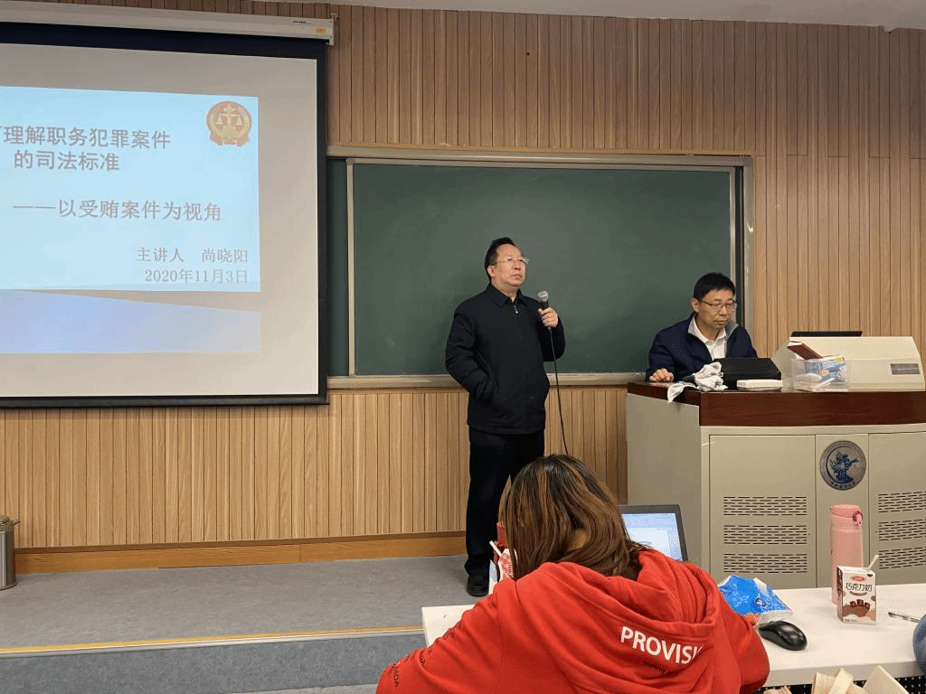 2020年11月3日晚,最高人民法院刑二庭尚曉陽法官蒞臨我院法律實(shí)務(wù)論壇,在主教103教室為我院研究生帶來題為“如何理解和把握職務(wù)犯罪案件的司法標(biāo)準(zhǔn)—以受賄案件為視角”的講座,本次講座由李邦友教授主持,副院長李偉副教授、教學(xué)事務(wù)主管張琪副教授、刑法教研室于洪偉副教授、李朝暉副教授和簡愛老師出席講座。