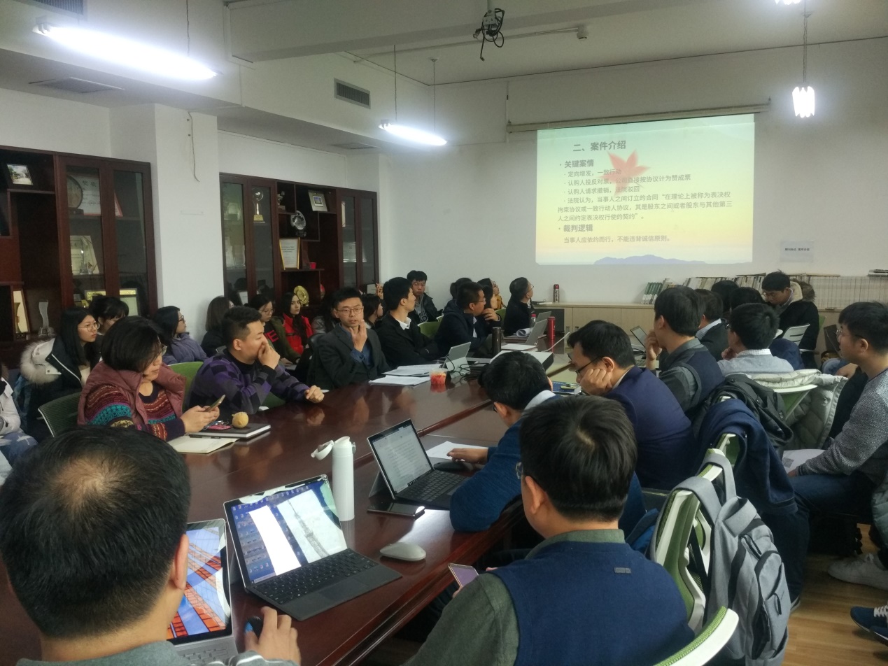 2018年12月5日中午,“學(xué)院難路”論壇第53講“協(xié)議緣何‘殺死’決議——以‘江西華電公司決議撤銷案’切入”在學(xué)院南路校區(qū)主教808會議室舉行。本次論壇由我院商法教研室副主任周游博士主講,院長尹飛教授、副院長李偉副教授、曾筱清教授、杜穎教授、黃震教授、曹曉燕副教授、許冰梅副教授、陳飛副教授、朱曉峰副教授、劉君博副教授、郭維真副教授、劉權(quán)副教授、趙真副教授、鄭玉雙副教授、武騰副教授、張曉冰博士、馬靜遠(yuǎn)博士、簡愛博士、潘佳博士、張金平博士、時業(yè)偉博士、白冰博士、徐建剛博士、王道發(fā)博士,以及我院部分博士生、碩士生和本科生出席并參加與談。我院殷秋實博士擔(dān)任主持人。